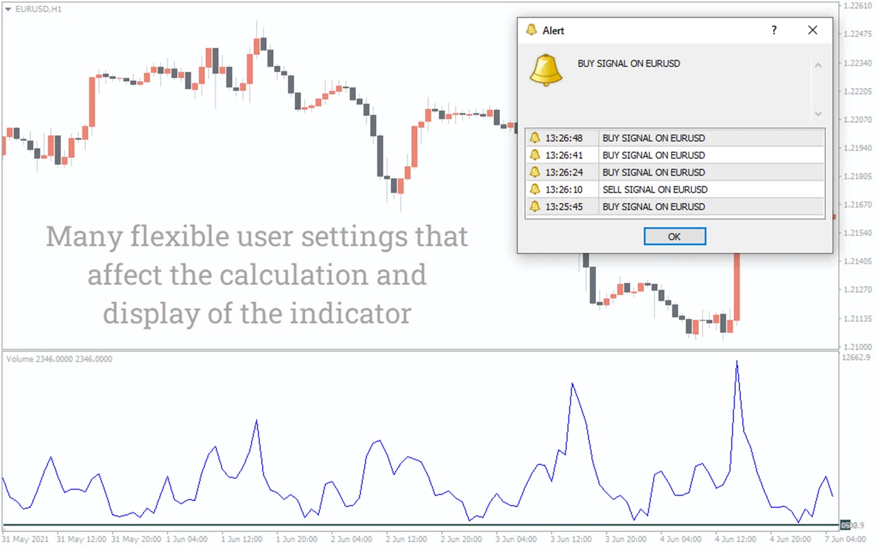 نمودار بالا EURUSD H1، نمودار قیمت کندل استیک، نشانگر را در حال عمل نشان می دهد. در واقع اندیکاتور در نمودار بالا از اندیکاتور RSI برای محاسبه واگرایی استفاده می کند. با این حال، معامله گران می توانند هر یک از اندیکاتورها را با استفاده از تنظیمات ورودی انتخاب کنند. علاوه بر این، این نشانگر با استفاده از اعلان های صدا، ایمیل و موبایل به معامله گران هشدار می دهد.