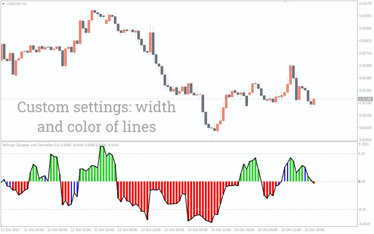 این نشانگر MT4 دارای سه رنگ هیستوگرام سیگنال قرمز، آبی و سبز است. هیستوگرام های قرمز زیر علامت صفر نشان دهنده روند نزولی است در حالی که هیستوگرام های سبز بالای علامت صفر نشان دهنده این است که بایاس صعودی است. در حالی که هیستوگرام های آبی نشان می دهد که قیمت در آستانه شکستن از یک محدوده است.