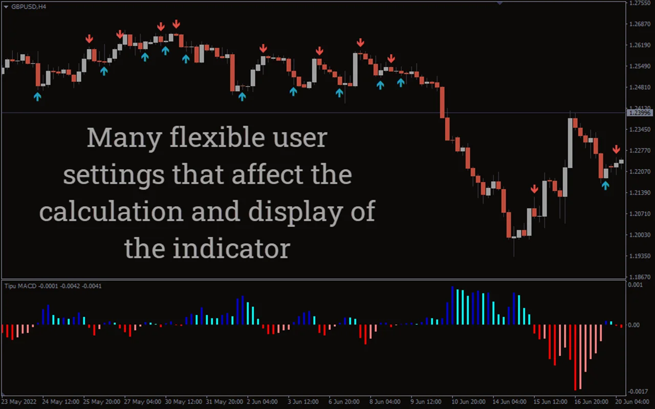 نمودار قیمت کندل GBPUSD H4 بالا نشانگر Tipu MACD را برای MT4 در حال کار نشان می دهد.به طور کلی، نشانگر MACD را به عنوان یک پنجره جداگانه نمایش می دهد.در واقع معامله گران می توانند از این اندیکاتور مشابه اندیکاتور MACD کلاسیک استفاده کنند.از آنجایی که اندیکاتور به پیش بینی تغییرات روند کمک می کند، معامله گران باید وارد بازار شوند و هنگامی که هیستوگرام قرمز است، سیگنال های خرید را اجرا کنند.به همین ترتیب، معامله گران باید معاملات فروش را زمانی انجام دهند که هیستوگرام سبز است.این به معاملهگر فنی فارکس امکان میدهد تا معاملاتی با نسبت ریسک به پاداش خوب وارد کند.با این حال، معامله گران می توانند زمانی که اندیکاتور از خط صفر عبور کند، وارد بازار به سمت جهت متقاطع شوند.